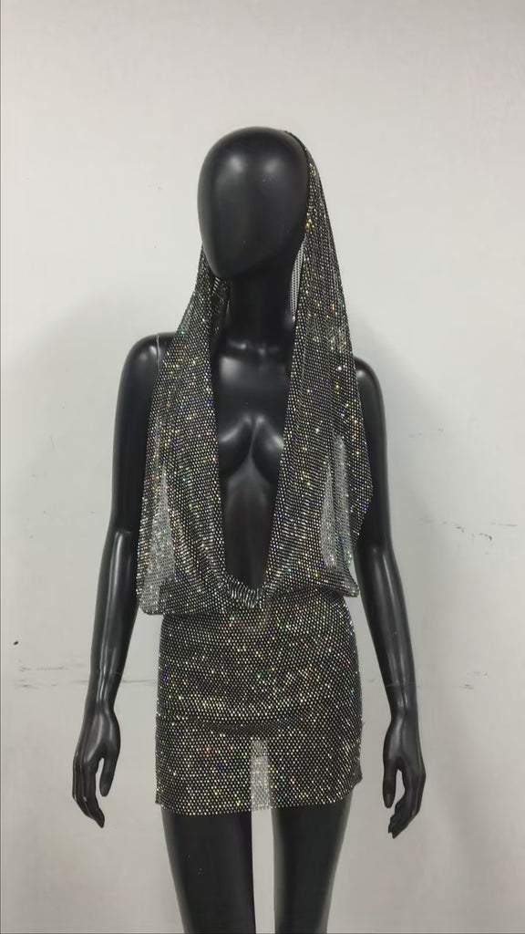 Y2K Streetwear See Through Mesh Shiny Rhinestone Bandana Head Wraps Dress